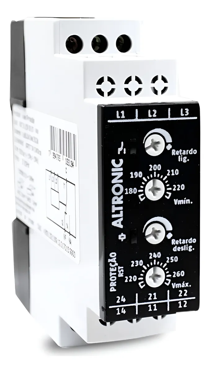 RELE SUPERVISOR TRIFASICO 220V COM RETARDO 60s 30s– ALTRONIC - 1RST212260S30S Modelo: 1RST212260S30S Marca: ALTRONIC Tipo: Falta de fase, assimetria modular, sequência de fase, mínima e máxima de fase, retardo ajustável no ligamento e desligamento Tempo de retardo ajustável: Ligamento 0s a 60s / Desligamento 0s a 30s Contatos: 1 SPDT Material dos contatos: Liga de Prata Tensão alimentação: 220Vca Frequência nominal: 50/60Hz